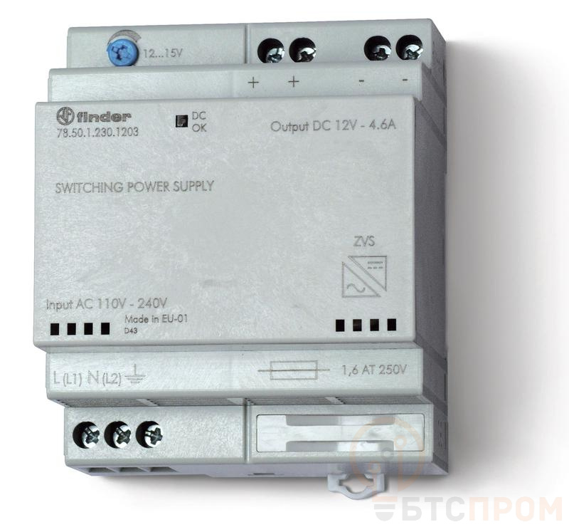 Источник питания импульсный вход 110...240В AC / выход 12В DC 50Вт модульный 70мм предохранитель входой цепи настройка выходного напряжения зарядка аккумуляторов IP20 FINDER 785112301203