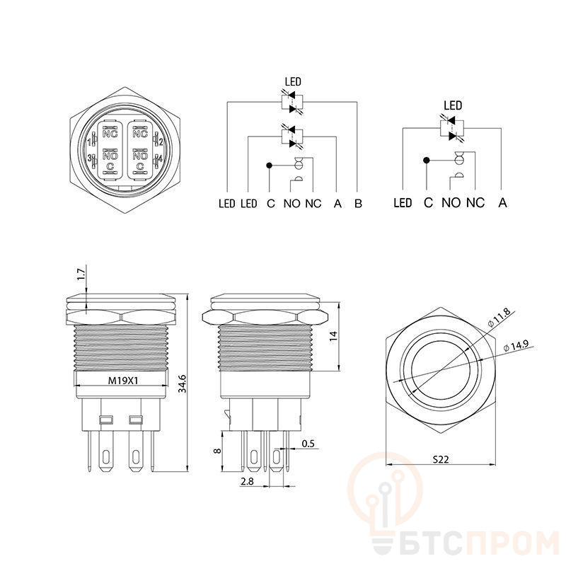 Выключатель-кнопка антивандальная O19 Фикс 250В (5с) ON-OFF/OFF-ON подсв/красная REXANT предназначена для коммутации электрических цепей напряжением до 250В путем включения-выключения питающего провода. Металлические кнопки применяются в местах, где существует большой риск их повреждения (на различных производственных линиях, в лифтовых кабинах, около входной двери и т.д.), а также для декоративного оформления панелей управления. Главными отличительными особенностями такой кнопки являются металлическое исполнение и неуязвимость контактной группы, что обеспечит ей долговечное функционирование. Изделие состоит из двух основных частей - лицевой части (головки) и контактной, и имеет пружинный возвратный механизм. Монтаж осуществляется без применения винтов на плоских панелях толщиной от 0.5мм до 10мм. Подключение проводов осуществляется с помощью винтовых зажимов, пайки или разъемом. Основные характеристики: Номинальное напряжение: 250В; Номинальный ток: 5A; Тип переключения: ON-OFF/OFF-ON; Количество контактных групп: 1; Количество контактов в контактной группе: 3; Фиксация положений: есть; Индикатор коммутационных положений: красный; Установочный диаметр: 19мм; Рабочая температура: от -25? до +85?; Степень защиты (IP): IP67; Ресурс: 10 000 циклов. Преимуществами использования данного изделия является надежность, быстрота и удобство монтажа.