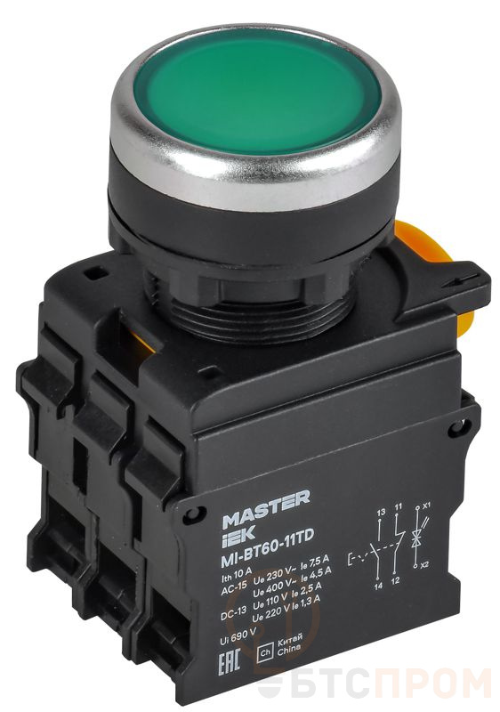 Кнопка d22мм 1НО+1НЗ MASTER с подсветкой и фиксацией зел. IEK MI-BT60-11TD-3-11-K06 фото в каталоге от BTSprom.by