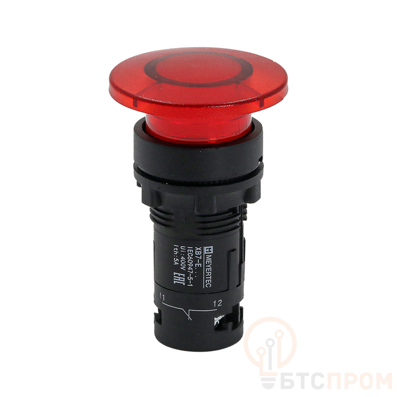 Ключевой особенностью данной модели является яркая красная подсветка, которая обеспечивает четкую индикацию статуса даже в условиях плохой освещенности. Коммутационная способность — 1 нормально замкнутый контакт (1NC), рассчитанный на напряжение 24В переменного или постоянного тока. Данная кнопка предназначена для аварийной остановки или включения/выключения мощных установок.