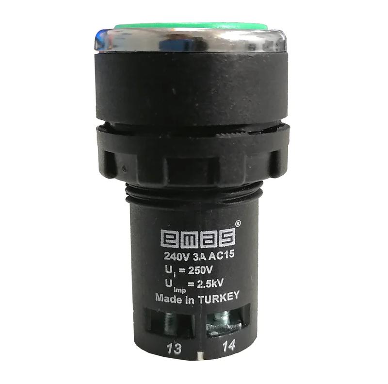 Кнопки нажимные EMAS коммутируют цепи сигнализации, питания и управления с номинальным напряжением переменного тока 240В, Разнообразные цветовые варианты позволяют наиболее эффективно компоновать щиты и панели. Применяются в электрощитах,промышленном оборудовании и на объектах энергоснабжения. Максимальная функциональность Легкий монтаж Блок-контакты снабжены огнестойким корпусом V0 PA6 Возможность присодинения блок-контакта подсветки Пластмассовые части изготовлены изоликарбоната Удобное и безопасное подключение кабеля Минимальный нагрев, максимальный срок службы Возможно любое положение при установке Механический ресурс 500 000 операции (минимальное значение) Электрический ресурс 100 000 операции (минимальное значение) Температура эксплуатации -5C / +40 C Защита IP IP50 Рабочая частота операций 1200/3000 операции в час Номинальное напряжение, Ue 250В перем. тока Номинальный ток, Ie 4A Номинальное напряжение изоляции, Ui 300В Номинальное импульсное напряжение, Uimp 2.5 kB Номинальное сопротивление изоляции не менее 10 МОм (при 500В пост. тока) Материал контактов AgNI Диэлектрическое сопротивление Между корп. и конт. -2000В перем. тока: откр. конт. -1500В перем. тока Попереное сечение соединительного кабеля 1,5 -2,5 кв.мм Стандарт UL 508, TS EN 60947-5-1, VDE0660