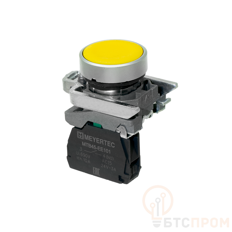 Модель обладает универсальной цветовой индикацией: желтая лицевая панель сигнализирует о специфическом функциональном назначении, например, запуск цикла или подтверждение действия. Контактная группа имеет 1 нормально разомкнутый (замыкающий) контакт (1NO). Устройство монтируется на дверцу шкафа или панель управления через отверстие диаметром 22.5 мм.