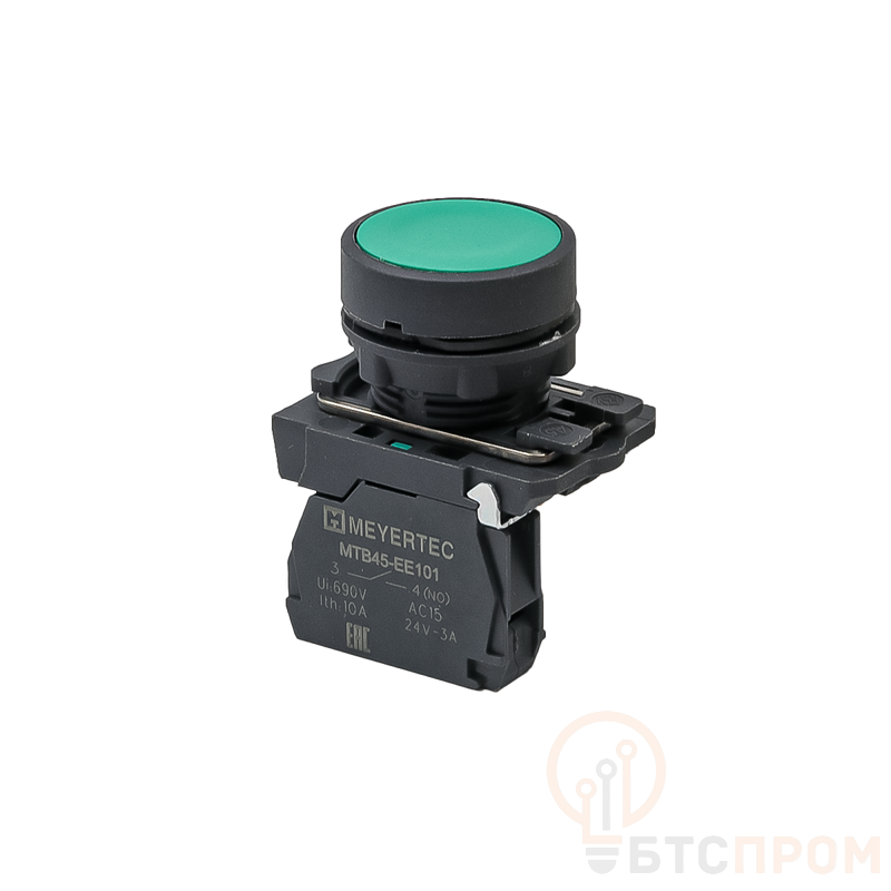Модель имеет нормально-разомкнутый (замыкающий) контакт 1NO. Яркая зеленая лицевая панель обеспечивает хорошую видимость и визуальное обозначение функции "Пуск" или "Включение". Устройство монтируется в стандартное отверстие на панели диаметром 22.5 мм.