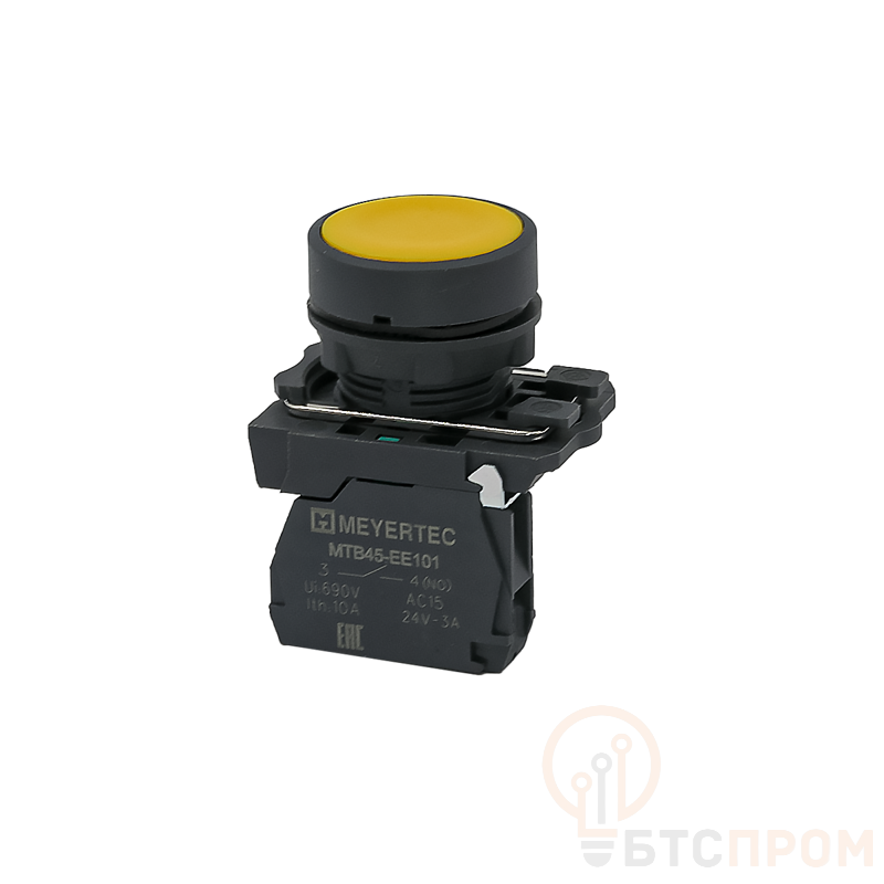 Устройство обладает высокой степенью защиты IP65, что гарантирует эффективную защиту от пыли и струй воды, позволяя использовать его в сложных промышленных условиях. Яркий желтый цвет лицевой части делает кнопку хорошо заметной, что идеально подходит для функций "Пуск" или выделения важного операционного элемента.
