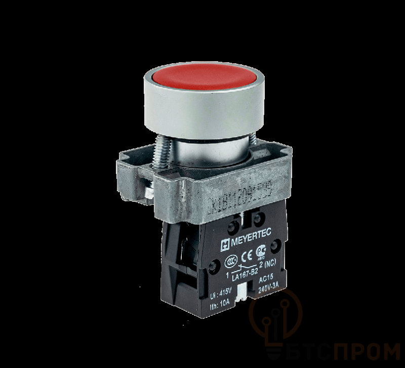 Контактная группа — 1 нормально-замкнутый (1NC) контакт, обеспечивающий разрыв цепи при нажатии. Монтируется в стандартное круглое отверстие на панель управления. Основная сфера применения: станки, конвейерные линии, промышленные автоматы и другие системы, где требуется надежная и безопасная остановка оборудования. Широко используется в машиностроении, энергетике и автоматизации технологических процессов.