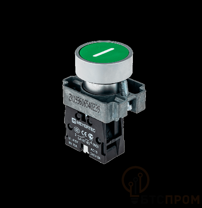 Кнопка управления плоская MTB2-BAZ11331 от компании ОВЕН — это надежный аппаратный элемент для промышленного оборудования с метрическим креплением. Устройство имеет зелёный цвет корпуса и маркировку в виде символа "I", обозначающую функцию включения или пуска.