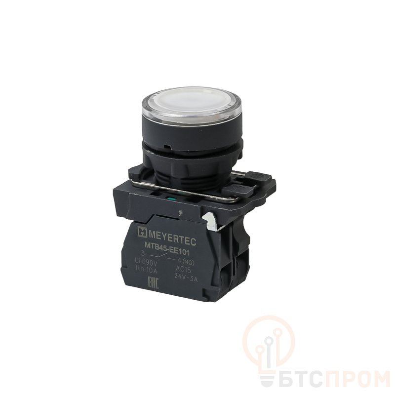 Кнопка управления MTB5-AW31711 от ОВЕН – это надежный и долговечный аппарат с защитой от внешних воздействий. Устройство имеет нормально-разомкнутый (1NO) контакт и рассчитано на напряжение 24В переменного или постоянного тока. Корпус из ударопрочного пластика обеспечивает высокую степень защиты IP65, что делает кнопку устойчивой к пыли и струям воды.