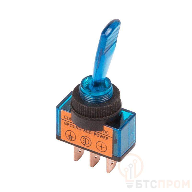 Тумблер 12V 20А (3c) ON-OFF однополюсный с синей LED подсветкой предназначен для коммутации электрических цепей напряжением 12В. Такая разновидность переключателей применяется на лицевых панелях в качестве комплектующих изделий различного электрооборудования (в измерительных приборах, блоках питания, электроустановках на различных производствах, легковых и грузовых автомобилях, поездах и многих других местах). Отличительной особенностью тумблера является перекидной переключатель, принцип действия которого основан на его перемещении в одну из позиций. Для переключения в нужное положение требуется приложить некоторые усилия. Монтаж осуществляется без применения винтов на плоских панелях толщиной от 0.8мм до 4мм. Подключение контактов осуществляется с помощью плоских клемм, либо с помощью пайки. Основные характеристики: Номинальное напряжение: 12В; Номинальный ток: 20A; Тип переключения: ON-OFF; Количество контактных групп: 1; Количество контактов в контактной группе: 2; Фиксация положений: да; Индикатор коммутационных положений: синий LED; Установочный диаметр: 12.2мм; Рабочая температура: от -25? до +85?; Степень защиты (IP): IP30; Ресурс: 10 000 циклов. Данный переключатель устанавливается на различные технические устройства, требующие высокой надежности в работе.