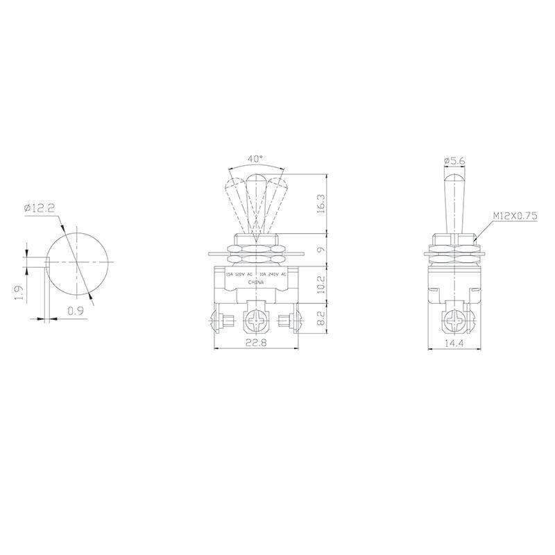 Технические характеристики: Номинальное напряжение: 250В; Номинальный ток: 10A (250VAC); Тип переключения: ON-OFF-ON; Количество контактных групп: 1; Количество контактов в контактной группе: 3; Фиксация положений: да; Индикатор коммутационных положений: отсутствует; Установочный диаметр: 12.2мм; Рабочая температура: от -25? до +85?; Ресурс: 10 000 циклов.