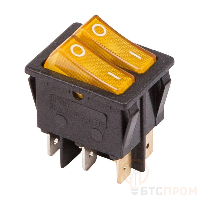 Двойной клавишный выключатель ON-OFF предназначен для коммутации электрических цепей. Используется для включения и выключения различного электрооборудования: сетевых фильтров и удлинителей, звукового оборудования, электроустановок на производстве и в автомобиле. Имеет два положения: принцип работы основан на перемещении клавиши в одну из позиций. Для переключения требуется приложить некоторое усилие. Две клавиши позволяют раздельно коммутировать контактные группы. Клавиши желтого цвета оснащены подсветкой, которая помогает отслеживать рабочее состояние прибора и делает выключатель заметным в темноте. Монтаж осуществляется без применения винтов на плоских панелях толщиной от 0,8 до 3 мм. Контакты подключаются либо плоской клеммой, либо с помощью пайки. Предельное напряжение: 1500 В (АС) не более 1 минуты. Контактное сопротивление: не более 35 мОм.