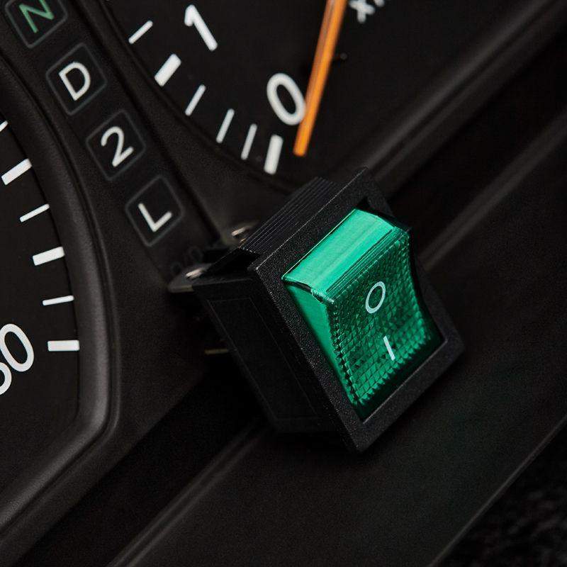 Клавишный выключатель ON-OFF предназначен для коммутации электрических цепей. Используется для включения и выключения различного электрооборудования: сетевых фильтров и удлинителей, звукового оборудования, электроустановок на производстве и в автомобиле. Имеет два положения: принцип работы основан на перемещении клавиши в одну из позиций. Для переключения требуется приложить некоторое усилие. Клавиша зеленого цвета оснащена подсветкой, которая помогает отслеживать рабочее состояние прибора и делает выключатель заметным в темноте. Монтаж осуществляется без применения винтов на плоских панелях толщиной от 0,8 до 3 мм. Контакты подключаются либо плоской клеммой, либо с помощью пайки. Предельное напряжение: 1500 В (АС) не более 1 минуты. Контактное сопротивление: не более 35 мОм.