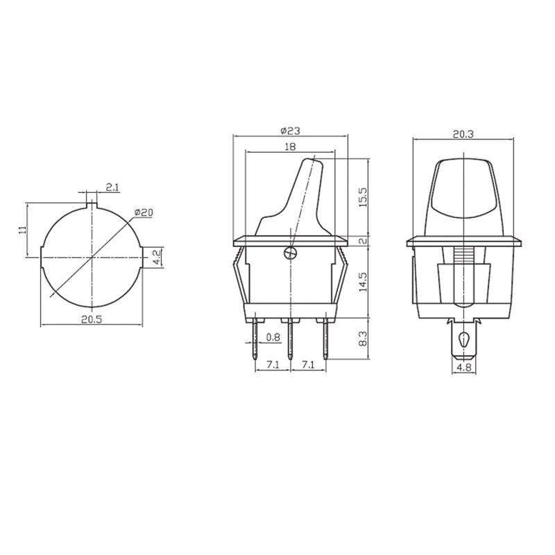 Выключатель клавишный круглый 250 V 16 А (3с) ON-OFF синий с подсветкой предназначен для коммутации электрических цепей напряжением 250 В. Клавишные (рокерные) выключатели применяются в качестве комплектующих изделий различного электрооборудования (аудиооборудовании, блоках питания, электроустановках на различных производствах, автомобилях и многих других местах). Такой переключатель имеет два положения и специфическую форму клавиша-тумблер. Принцип действия основан на перемещении клавиши в одну из позиций. Для переключения в нужное положение требуется приложить некоторые усилия на клавишу. Монтаж осуществляется без применения винтов на плоских панелях толщиной от 0.8 мм до 3 мм. Подключение контактов осуществляется плоской клеммой либо с помощью пайки. Основные характеристики: Номинальное напряжение: 250 В Номинальный ток: 16 A Контактное сопротивление: не более 35 мОм Тип переключения: ON-OFF Количество контактных групп: 1 Количество контактов в контактной группе: 3 Фиксация положений: да Индикатор коммутационных положений: синий Рабочая температура: –25...+85 ? Ресурс: 10 000 циклов