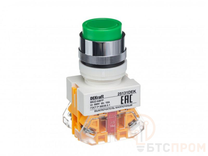 Выключатель кнопочный серии ВК-22 Dekraft; выступающий толкатель с фиксацией; зеленый; без индикации; ном.ток 10 А; установка - на панели или двери; степень защиты - IP54; подключение - винтовыми зажимами. Выключатели кнопочные ВК-22 предназначены для коммутации электрических цепей и индикации состояния электрических цепей. Применяются в сетях переменного тока частотой 50/60 Гц с напряжением до 660В. Могут устанавливаться на подвижных и неподвижных частях стационарных установок.