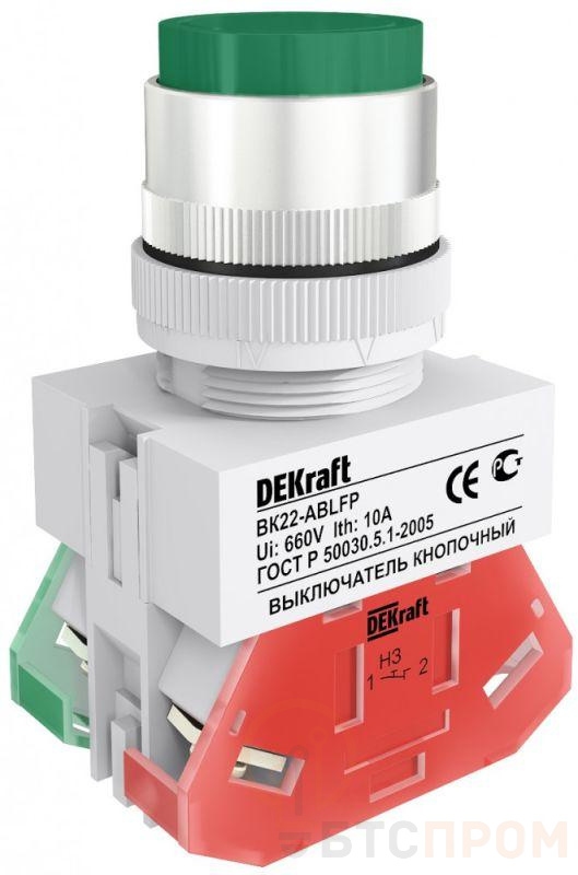 Выключатель кнопочный серии ВК-22 Dekraft; с выступающим толкателем; зеленый; без индикации; ном.ток 10 А; установка - на панели или двери; степень защиты - IP54; подключение - винтовыми зажимами. Выключатели кнопочные ВК-22 предназначены для коммутации электрических цепей и индикации состояния электрических цепей. Применяются в сетях переменного тока частотой 50/60 Гц с напряжением до 660В. Могут устанавливаться на подвижных и неподвижных частях стационарных установок.