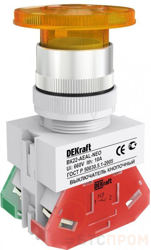 Выключатель кнопочный серии ВК-22 Dekraft; грибовидный толкатель; желтый; с неоновой лампой; ном.ток 10 А; установка - на панели или двери; степень защиты - IP54; подключение - винтовыми зажимами. Выключатели кнопочные ВК-22 предназначены для коммутации электрических цепей и индикации состояния электрических цепей. Применяются в сетях переменного тока частотой 50/60 Гц с напряжением до 660В. Могут устанавливаться на подвижных и неподвижных частях стационарных установок.