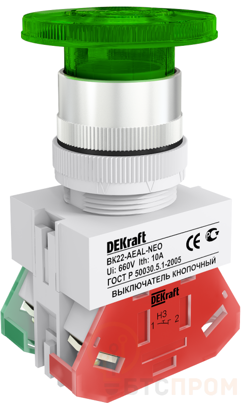 Выключатель кнопочный серии ВК-22 Dekraft; с грибовидным толкателем; зеленый; с неоновой лампой; ном.ток 10 А; установка - на панели или двери; степень защиты - IP54; подключение - винтовыми зажимами. Выключатели кнопочные ВК-22 предназначены для коммутации электрических цепей и индикации состояния электрических цепей. Применяются в сетях переменного тока частотой 50/60 Гц с напряжением до 660В. Могут устанавливаться на подвижных и неподвижных частях стационарных установок.