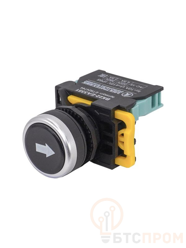 Выключатель кнопочный ВК22-EA3351 от производителя Электротехник — это надежный и долговечный элемент управления для промышленного оборудования и специализированной техники. Модель оснащена цилиндрической лицевой частью диаметром 22 мм и имеет две независимые кнопки с интуитивно понятной маркировкой "Стелка вверх" и "Стрелка вниз". Каждая кнопка является нормально разомкнутой контактной группой (1НО), что обеспечивает замыкание цепи только при нажатии.