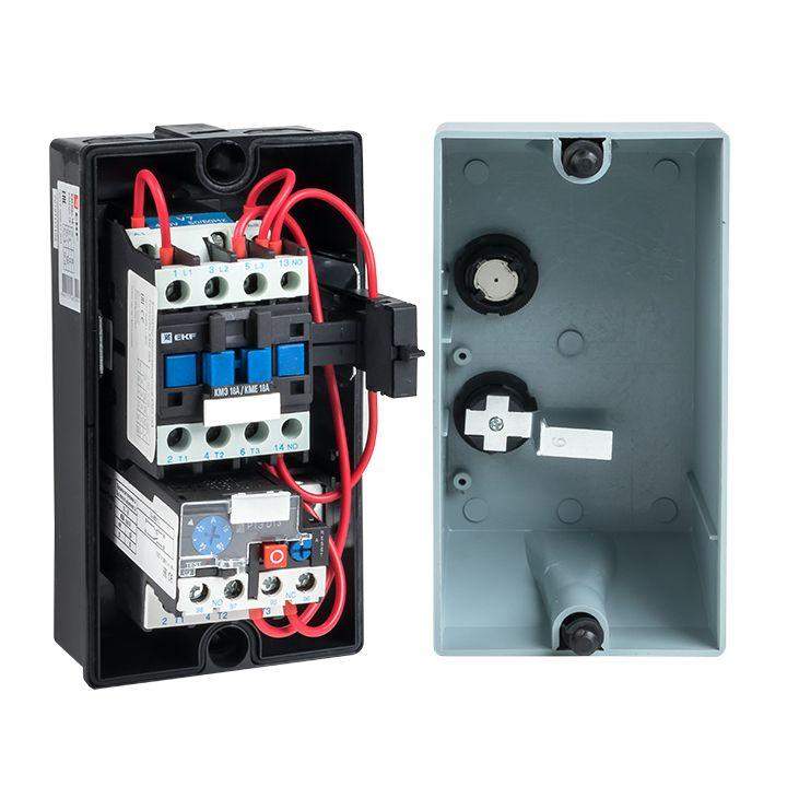 Пускатель магнитный КМЭ EKF PROxima является комплектным устройством, состоящим из малогабаритного контактора КМЭ, теплового реле РТЭ, оболочки с сальниками и кнопок управления. Пускатели предназначены для дистанционного пуска непосредственным подключением к сети и остановки трехфазных асинхронных электродвигателей с короткозамкнутым ротором на напряжение переменного тока до 400 В, а также для защиты электродвигателей от перегрузок недопустимой продолжительности и сверхтоков, возникающих при обрыве одной из фаз. При применении контакторов КМЭ 0910 – КМЭ 3210 используется пластиковый корпус, контакторов КМЭ 4011 – КМЭ 9511 – металлическая оболочка.