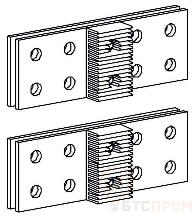 Шина подключения для выключателей-разъединителей серии SystemePact SP SD на ток 1250 А, 4P; комплект – 2 шт. Шины подключения применяются для последовательного или параллельного соединения 3-х и 4-хполюсных выключателей в сетях постоянного тока для снижения эксплуатационных издержек. Последовательное подключение уменьшает напряжение на каждом полюсе, что позволяет отключать большие токи короткого замыкания. Параллельное подключение оптимизирует использование аппаратов по номинальному току.
