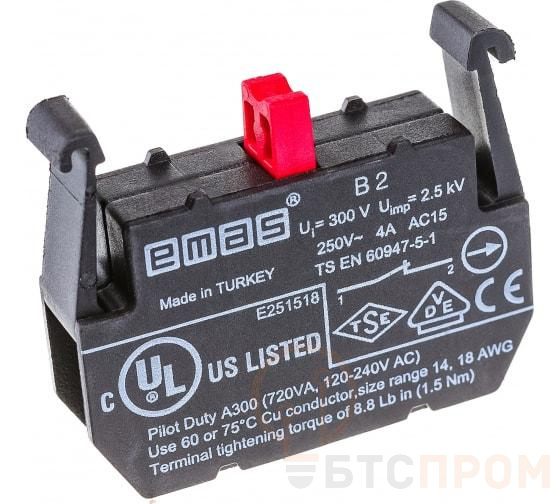 Блок-контакт "Стоп" (1НЗ) EMAS серии B2 — это надежная кнопка управления в стандартном исполнении. Устройство имеет 1 нормально замкнутый (размыкающий) контакт (1НЗ), который обеспечивает безопасное прерывание цепи при нажатии. Корпус выполнен из прочного пластика, а сама кнопка имеет яркую красную цветовую индикацию для мгновенного визуального опознания функции "Стоп" или "Аварийная остановка".