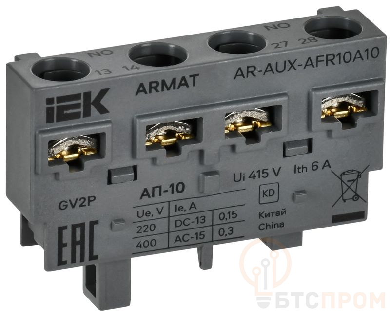 Дополнительный аварийный контакт для автоматического выключателя защиты двигателя серии ARMAT предназначен для сигнализации положения механизма взвода выключателей. Переключение контактов происходит только при срабатывании выключателя от сверхтока. Для проверки переключения контактов аварийного срабатывания необходимо нажать кнопку тест. Дополнительный аварийный контакт соответствует требованиям ТР ТС 004/2011
