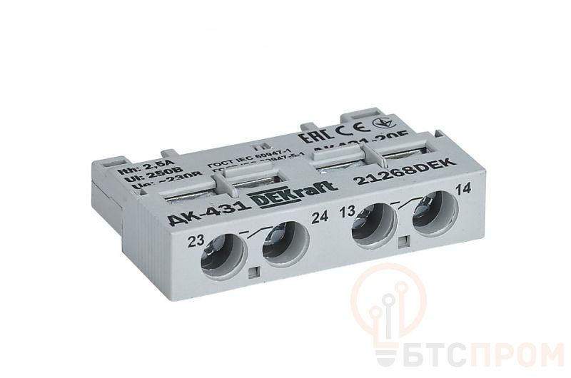 Дополнительные контакты серии ДК-431 F Dekraft; фронтальная установка; кол-во и тип контактов - 2НО; ток терм. стойкости 2,5 А. Дополнительные контакты серии ДК-431 F предназначены для сигнализации о состоянии главных контактов автоматических выключателей ВА-431: включены - выключены. Переключение контактов ДК-431 F происходит, даже если рукоятка управления выключателя удерживается во взведенном положении.