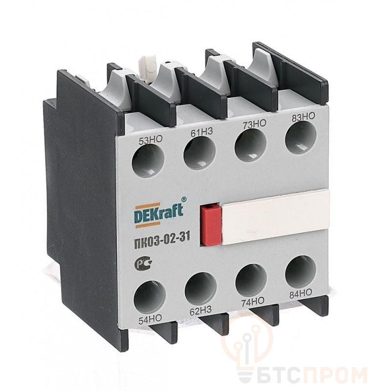 Приставка контактная серии ПК-03-02 для контакторов КМ-103 Dekraft; кол-во контактов - 3НО+1НЗ; ном.ток 10 А; ном.напряжение до 690 В; установка с лицевой стороны; степень защиты IP20. Приставки контактные предназначены для увеличения количества вспомогательных контактов контактора. Контактные приставки механически соединяются с контакторами и фиксируются при помощи защелки. Приставка подходит для использования с контакторами других производителей.