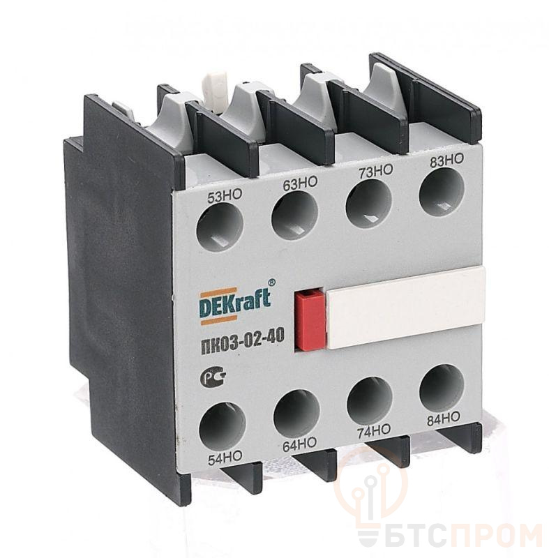 Приставка контактная серии ПК-03-02 для контакторов КМ-103 Dekraft; кол-во контактов - 4НО; ном.ток 10 А; ном.напряжение до 690 В; установка с лицевой стороны; степень защиты IP20. Приставки контактные предназначены для увеличения количества вспомогательных контактов контактора. Контактные приставки механически соединяются с контакторами и фиксируются при помощи защелки. Приставка подходит для использования с контакторами других производителей.