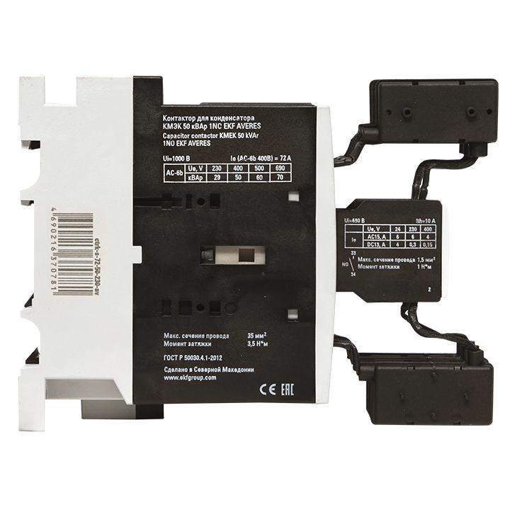 Контактор для конденсатора КМЭК AVERES - это специализированный контактор двухступенчатого включения для коммутации конденсаторов в установках компенсации реактивной мощности (УКРМ). Контакторы КМЭК EKF AVERES состоят из корпуса, закрепленных в нем двух рядов неподвижных контактов, подвижных контактов, которые закреплены в подвижной части магнитной системы. На первом ряду контактов с коммутированы зарядные резисторы. Неподвижная часть магнитной системы закреплена жестко в корпусе КМЭК. Пружина препятствует смыканию контактов. При подаче напряжения на катушку управления в магнитной системе контактора возникает магнитное поле, которое, преодолевая сопротивление пружины, смыкает магнитную систему и замыкает сначала верхнюю группу контактов и через 0,1-0,2 секунды вторую, силовую группу контактов. При этом пусковой ток конденсаторов гаситься на резисторах. При отключении напряжения с катушки управления пружина размыкает контакты. Возможна коммутация алюминиевым и медным проводом.
