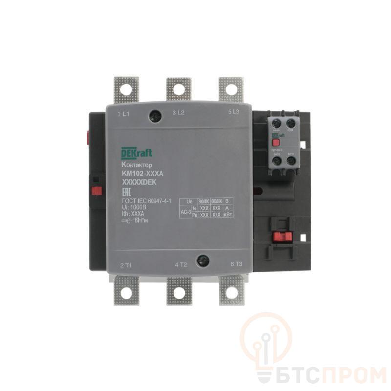 Контактор серии КМ-102 Dekraft; 3P; номинальный ток - 185 А (AC3, AC4); напряжение управления 110 В пер.тока; доп.контакты 1НО+1НЗ; установка на монтажную плату. Контакторы КМ-102 предназначены для пуска и останова асинхронных двигателей, для коммутации осветительных сетей, в сетях напряжением до 690 В пер.тока. Дополнительные защитные крышки исключают попадание пыли внутрь контактора и обеспечивают защиту от случайного прикосновения.