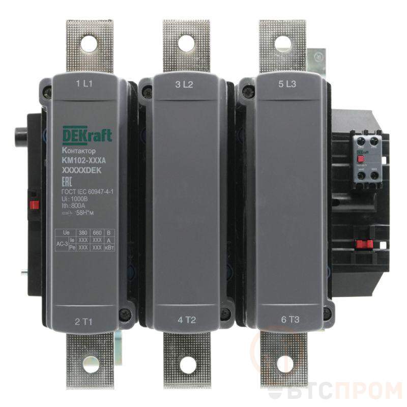 Контактор серии КМ-102 Dekraft; 3P; номинальный ток - 630 А (AC3, AC4); напряжение управления 400 В пер.тока; доп.контакты 1НО+1НЗ; установка на монтажную плату. Контакторы КМ-102 предназначены для пуска и останова асинхронных двигателей, для коммутации осветительных сетей, в сетях напряжением до 690 В пер.тока. Дополнительные защитные крышки исключают попадание пыли внутрь контактора и обеспечивают защиту от случайного прикосновения.