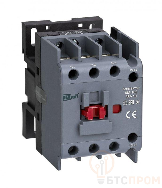 Контактор КМ-102 от DEKraft — это современный электромагнитный аппарат, предназначенный для дистанционного управления мощными нагрузками в цепях переменного тока. Устройство рассчитано на номинальный ток 38 А и рабочее напряжение до 400 В. Оно обладает одной нормально разомкнутой (1НО) силовой парой контактов и соответствует категориям применения AC-3 (для пуска и отключения асинхронных электродвигателей с короткозамкнутым ротором) и AC-4 (для тяжелых режимов работы, таких как пуск противовключением).