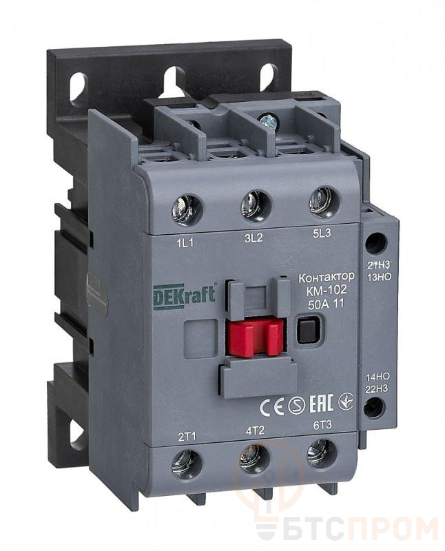 Контактор КМ-102 DEKraft — это современный трехполюсный электромагнитный аппарат, предназначенный для дистанционного управления мощной нагрузкой. Номинальный ток главных цепей составляет 50 А при категории применения AC-3 (пуск и отключение двигателей с короткозамкнутым ротором) на напряжение до 440 В переменного тока.