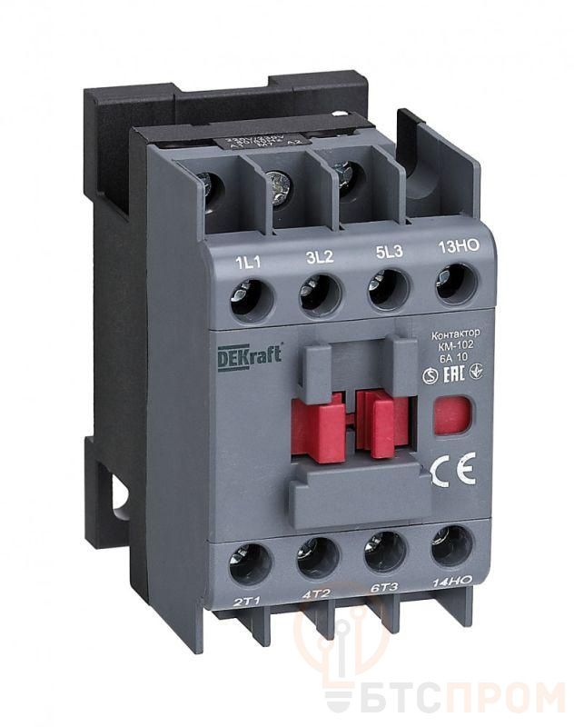 Контактор КМ-102 от DEKraft — это компактный и надежный электромагнитный аппарат, предназначенный для дистанционного управления и коммутации силовых цепей. Номинальный ток главных цепей составляет 6 А при напряжении катушки управления 110 В переменного тока. Устройство имеет одну нормально замкнутую (1НЗ) вспомогательную контактную группу.