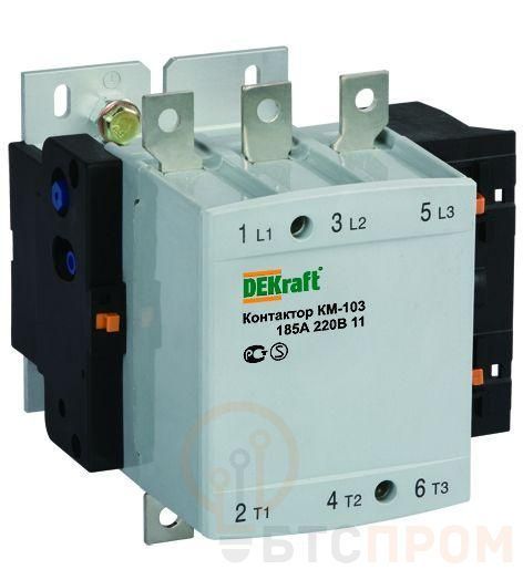 Контактор серии КМ-103 Dekraft; 3P; номинальный ток 185 А (AC3); напряжение управления 220 В пер.тока; установка на монтажную плату или профили. Контакторы КМ-103 предназначены для пуска и останова асинхронных двигателей, для коммутации различных нагрузок в сетях напряжением до 690 В пер.тока. Дополнительные контакты и приставки контакторов приобретаются отдельно.