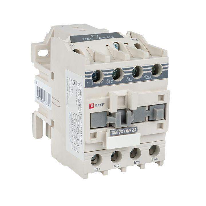 Контакторы КМЭ EKF PROxima состоят из корпуса, закрепленных в нем неподвижных контактов, подвижных контактов, которые закреплены в подвижной части магнитной системы. Неподвижная часть магнитной системы закреплена жестко в корпусе КМЭ. Пружина препятствует смыканию контактов. При подаче напряжения на катушку управления в магнитной системе контактора возникает магнитное поле, которое, преодолевая сопротивление пружины, смыкает магнитную систему и замыкает контакты. При отключении напряжения с катушки управления пружина размыкает контакты. Возможна коммутация алюминиевым и медным проводом. Основное назначение контактора КМЭ – частые дистанционные включения и выключения силовых электрических цепей в нормальном режиме работы.