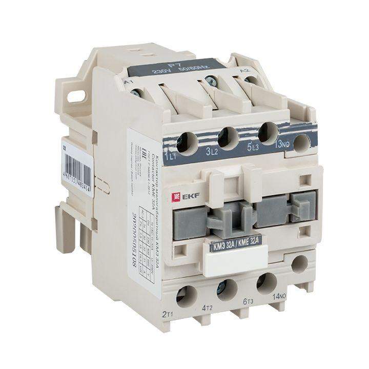 Контакторы КМЭ EKF PROxima состоят из корпуса, закрепленных в нем неподвижных контактов, подвижных контактов, которые закреплены в подвижной части магнитной системы. Неподвижная часть магнитной системы закреплена жестко в корпусе КМЭ. Пружина препятствует смыканию контактов. При подаче напряжения на катушку управления в магнитной системе контактора возникает магнитное поле, которое, преодолевая сопротивление пружины, смыкает магнитную систему и замыкает контакты. При отключении напряжения с катушки управления пружина размыкает контакты. Возможна коммутация алюминиевым и медным проводом. Основное назначение контактора КМЭ – частые дистанционные включения и выключения силовых электрических цепей в нормальном режиме работы.