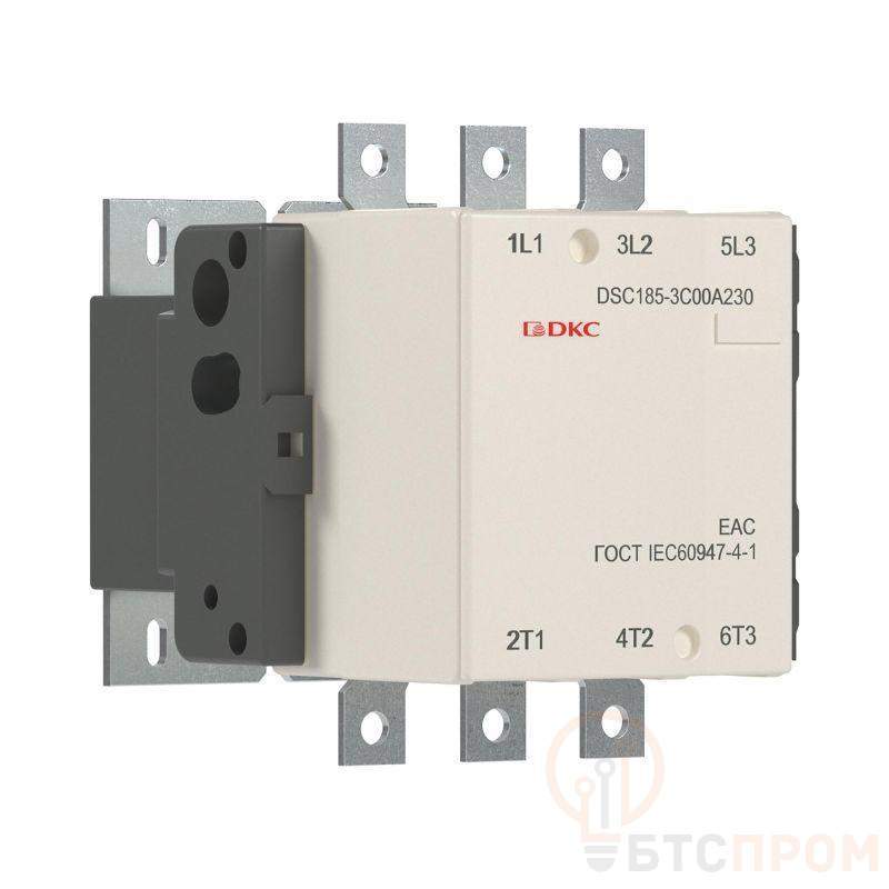 Электромагнитный контактор DSC185-3C00A230 185А 90 кВт (AC3) с катушкой 220 В AC для коммутации асинхронных двигателей, частотных приводов и других высокоиндуктивных нагрузок (категория применения АС-3), а также для работы в тяжелых режимах, таких как пуск и торможение противовключением электродвигателей с короткозамкнутым ротором (АС-4).