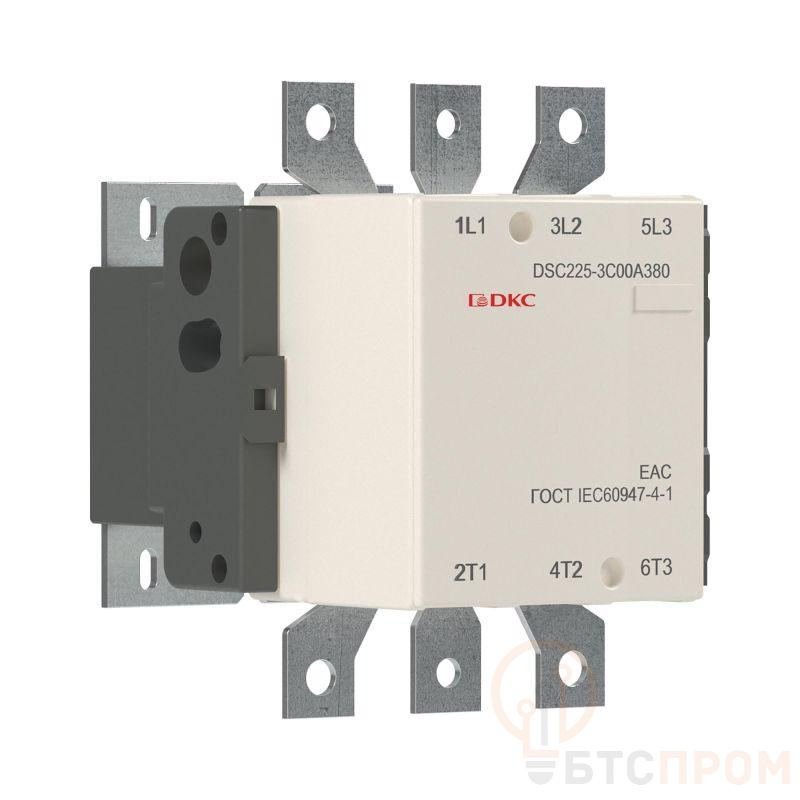 Электромагнитный контактор DSC225-3C00A380 225А 110 кВт (AC3) с катушкой 380 В AC для коммутации асинхронных двигателей, частотных приводов и других высокоиндуктивных нагрузок (категория применения АС-3), а также для работы в тяжелых режимах, таких как пуск и торможение противовключением электродвигателей с короткозамкнутым ротором (АС-4).