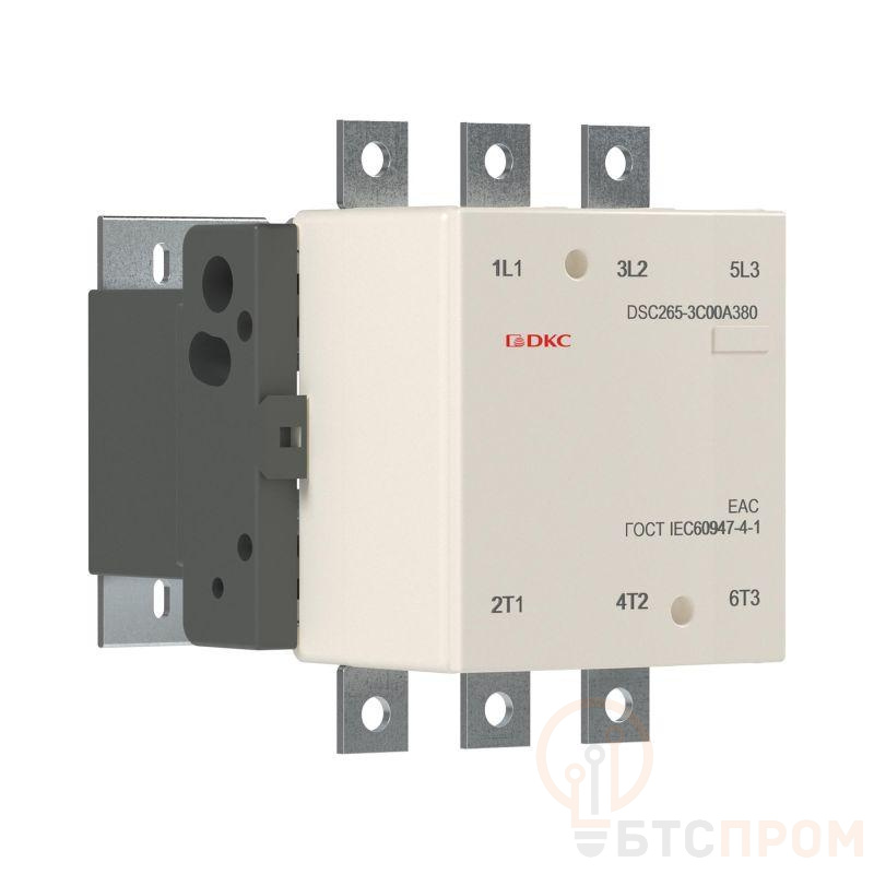 Электромагнитный контактор DSC265-3C00A380 265А 130 кВт (AC3) с катушкой 380 В AC для коммутации асинхронных двигателей, частотных приводов и других высокоиндуктивных нагрузок (категория применения АС-3), а также для работы в тяжелых режимах, таких как пуск и торможение противовключением электродвигателей с короткозамкнутым ротором (АС-4).