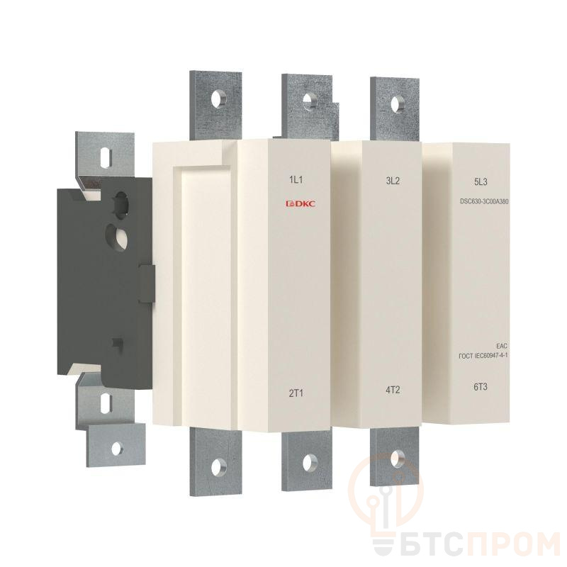 Электромагнитный контактор DSC630-3C00A380 630А 335 кВт (AC3) с катушкой 380 В AC для коммутации асинхронных двигателей, частотных приводов и других высокоиндуктивных нагрузок (категория применения АС-3), а также для работы в тяжелых режимах, таких как пуск и торможение противовключением электродвигателей с короткозамкнутым ротором (АС-4).