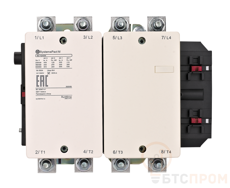 Контактор серии SystemePact MC1G на номинальный ток 500 А по категории применения АС1 / 400 А по АС3, 4P, напряжение управления 110 В пер. тока. Четырехполюсные контакторы серии SystemePact MC1G преимущественно используются для управления активными и слабоиндуктивными нагрузками: в схемах АВР, цепях освещения, для коммутации резистивных нагревательных элементов. Могут оснащаться дополнительными контактами и механической блокировкой.