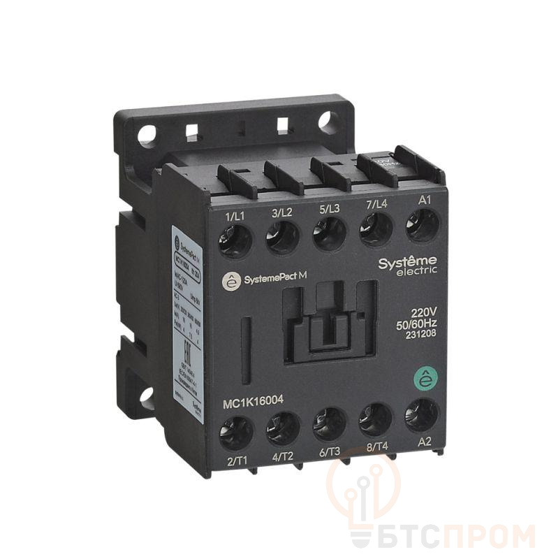 Контактор серии SystemePact MC1K для сетей переменного тока, номинальный ток – 6 А, 4P(4НО), напряжение управления – 400 В пер.тока, монтаж – на DIN-рейке или винтами на монтажной плате. Контакторы серии MC1K предназначены для управления не индуктивной или слабо индуктивной нагрузкой (AC-1), а также для применения в простых системах автоматизации.