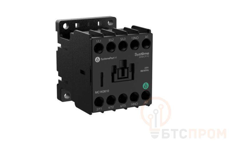 Контактор серии SystemePact MC1K для сетей переменного тока, номинальный ток – 6 А, 3P, 1НЗ, напряжение управления – 220 В пер.тока, монтаж – на DIN-рейке или винтами на монтажной плате. Контакторы серии MC1K предназначены для управления двигателями (категория AC-3 и AC-4), а также для применения в простых системах автоматизации.