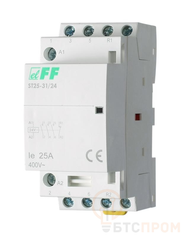 <p>Модульный контактор ST25-31/24 от бренда F&F — это компактное и надежное устройство, предназначенное для коммутации электрических цепей управления, освещения и других нагрузок в однофазных и трехфазных сетях. Модель EA13.001.015 обладает контактной группой 3НО+1НЗ (три нормально разомкнутых и один нормально замкнутый контакт) и рассчитана на номинальный ток 25А.</p>