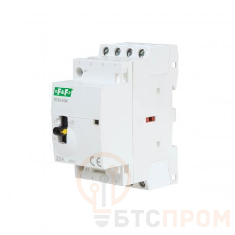 Контактор серии "ST" Предназначен для коммутации электрических цепей повышенной мощности. Наличие переключателя на лицевой панели позволяет вручную управлять контактами контактора (независимо от наличия напряжения питания на катушке). Особенности - Ручное управление - Питание катушки от сети переменного тока Область применения Применяется для автоматизации и управления различных технологических процессов, в том числе в системах освещения, кондиционирования, вентиляции и т.д. Принцип работы Принцип работы контактора зависит от положения переключателя режима работы: Положение «I» При отсутствии напряжения питания на катушке контакты контактора замкнуты. Подача напряжения питание на катушку автоматически переводит переключатель в положение "auto" и контактор работает в автоматическом режиме. Чтобы зафиксировать контакты в замкнутом состоянии независимо от наличия напряжения питания контактора необходимо в положении „I” переместить желтый рычаг блокировки влево. Рабочее состояние контактора сигнализируется поднятым красным флажком на лицевой панели. Положение «auto» Подача напряжения питания на катушку контактора приводит к замыканию контактов. После отключения напряжения питания контакты возвращаются в своё первоначальное положение. Положение «О» Контакты контактора остаются разомкнутыми независимо от наличия напряжения питания. напряжение питания 230 В АС максимальный ток нагрузки - 25 А; контакты - 4NO;