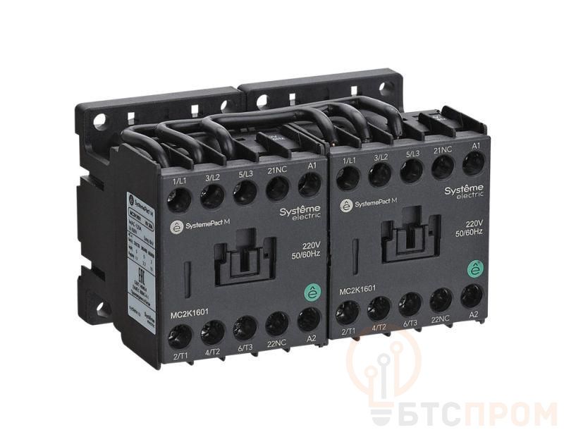 Реверсивный контактор серии SystemePact MC2K для сетей переменного тока, номинальный ток – 16 А, 3P, 1НЗ, напряжение управления – 380 В пер.тока, монтаж – на DIN-рейке или винтами на монтажной плате. Реверсивные контакторы серии MC2K предназначены для управления двигателями, а также для применения в простых системах автоматизации.