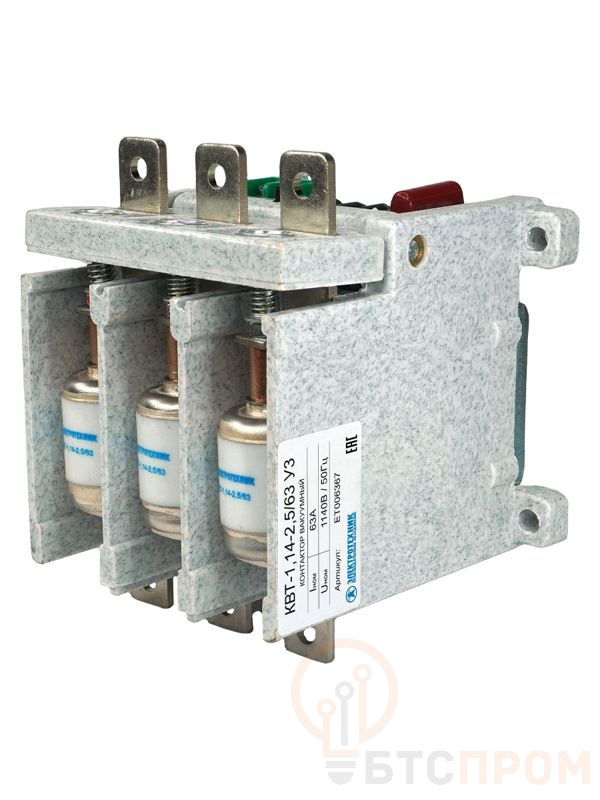 Контакторы вакуумные серии КВТ открытого исполнения с естественным воздушным охлаждением, встраиваемые в комплектные устройства, предназначены для использования в пускателях, станциях управления, для коммутации токов включения и отключения асинхронных электродвигателей с короткозамкнутым ротором и других приёмников электроэнергии в системах дистанционного управления электроприводами с тяжёлым режимом работы в цепи переменного тока 50-60 Гц, напряжением до 1140 В. Благодаря высокой электрической прочности вакуумного промежутка и отсутствию среды, поддерживающей горение дуги, электрическая дуга распадается и гаснет. * высокий коммутационный и энергетический ресурс; * высокая кратковременная нагрузочная способность для тяжелых пусков; * отсутствие открытой электрической дуги и продуктов горения, * высокое быстродействие; * максимальная пожаро- и взрывобезопасность; * низкий уровень шумов во время эксплуатации.
