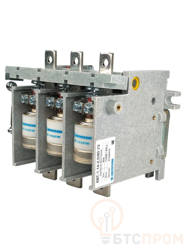 Контакторы вакуумные серии КВТ открытого исполнения с естественным воздушным охлаждением, встраиваемые в комплектные устройства, предназначены для использования в пускателях, станциях управления, для коммутации токов включения и отключения асинхронных электродвигателей с короткозамкнутым ротором и других приёмников электроэнергии в системах дистанционного управления электроприводами с тяжёлым режимом работы в цепи переменного тока 50-60 Гц, напряжением до 1140 В. Благодаря высокой электрической прочности вакуумного промежутка и отсутствию среды, поддерживающей горение дуги, электрическая дуга распадается и гаснет. * высокий коммутационный и энергетический ресурс; * высокая кратковременная нагрузочная способность для тяжелых пусков; * отсутствие открытой электрической дуги и продуктов горения, * высокое быстродействие; * максимальная пожаро- и взрывобезопасность; * низкий уровень шумов во время эксплуатации.