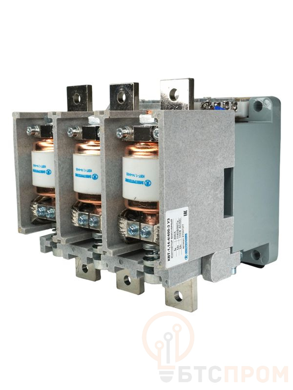 Контакторы вакуумные серии КВТ открытого исполнения с естественным воздушным охлаждением, встраиваемые в комплектные устройства, предназначены для использования в пускателях, станциях управления, для коммутации токов включения и отключения асинхронных электродвигателей с короткозамкнутым ротором и других приёмников электроэнергии в системах дистанционного управления электроприводами с тяжёлым режимом работы в цепи переменного тока 50-60 Гц, напряжением до 1140 В. Благодаря высокой электрической прочности вакуумного промежутка и отсутствию среды, поддерживающей горение дуги, электрическая дуга распадается и гаснет. * высокий коммутационный и энергетический ресурс; * высокая кратковременная нагрузочная способность для тяжелых пусков; * отсутствие открытой электрической дуги и продуктов горения, * высокое быстродействие; * максимальная пожаро- и взрывобезопасность; * низкий уровень шумов во время эксплуатации.
